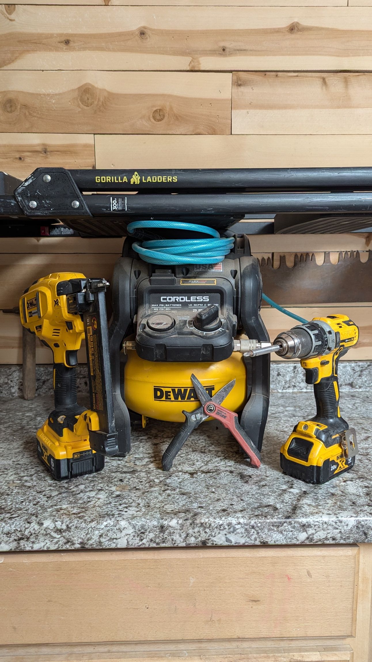 · Cordless Compressor - This small DeWalt compressor cost me $260 and enabled me to never have to carry my large compressor ever again. Sure if I ever end up framing a shed I might need to bring along the big one, but until then, this little guy does everything I need without extension cords and without taking up too much space in the van. Fast And Light!
