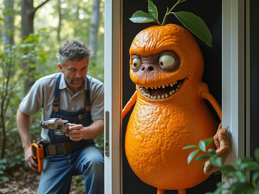 I generated an image with the prompt: 'Bitter Orange Crazy Lady, an old woman part orange fruit and part human, nagging while a handyman installs a sliding screen door for the patio' using Grok on the X Platform.