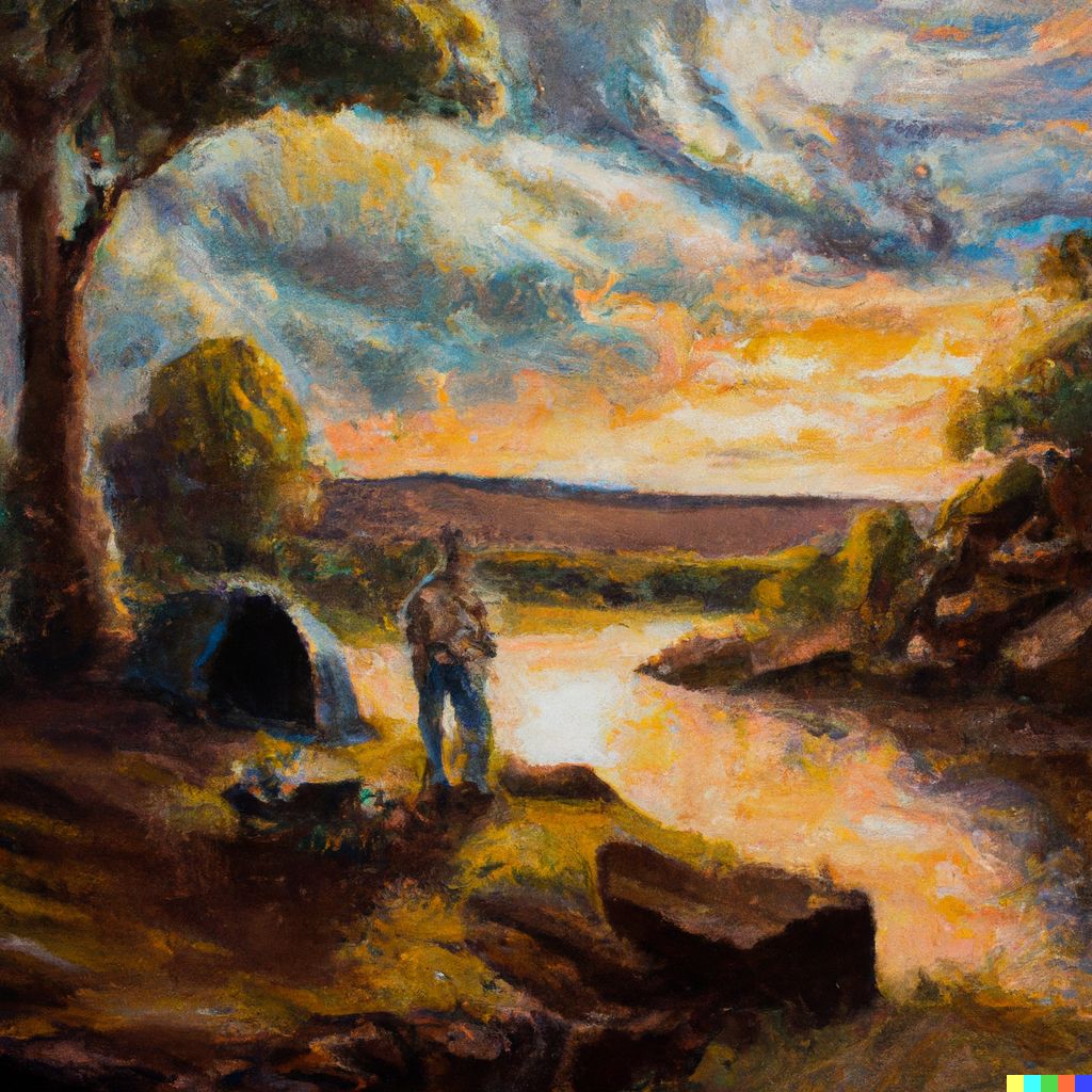 AI Generated - Prompt: an oil painting of a man at a campsite next to a river at sunset